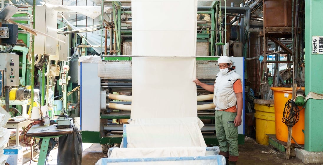 すべての工程を経た生地は、最終的に手作業と目視で丁寧に仕上げられます。風合いや状態を確認しながら、製品として自身を以ってお届けできるよう大量生産の中にも「人の目と手による品質管理」を大切にしています。